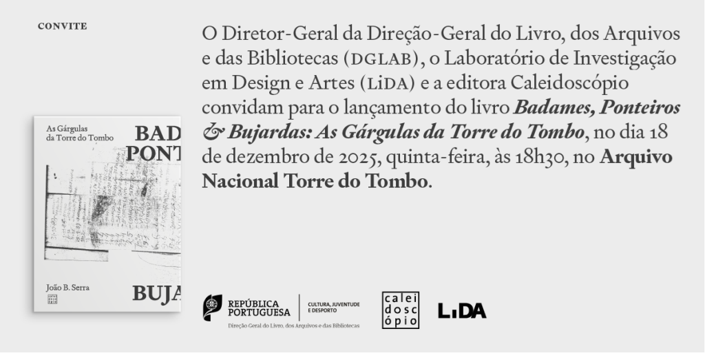 O Diretor-Geral da Direção-Geral do Livro, dos Arquivos e das Bibliotecas (DGLAB), o Laboratório de Investigação em Design e Artes (LiDA) e a editora Caleidoscópio convidam para o lançamento do livro Badames, Ponteiros & Bujardas: As Gárgulas da Torre do Tombo, no dia 18 de dezembro de 2025, quinta-feira, às 18h30, no Arquivo Nacional Torre do Tombo.