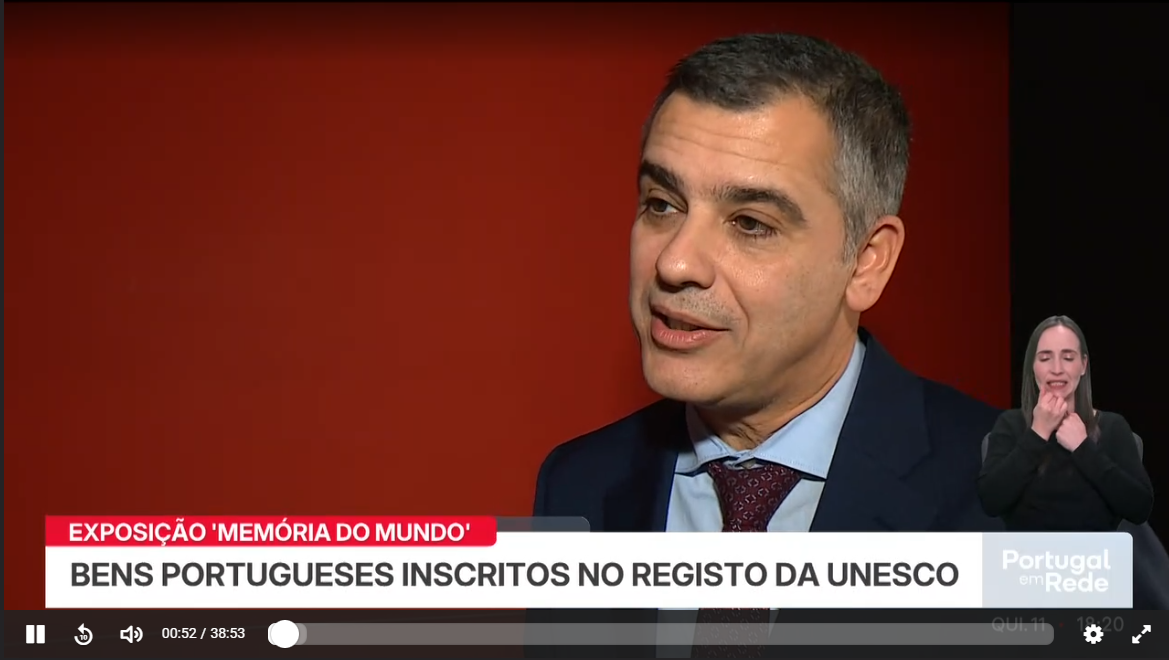 Por ocasião da exposição “Memória do Mundo. Bens Portugueses Inscritos no Registo Internacional da UNESCO”, veja a entrevista concedida à jornalista Filipa Marques Henriques, da RTP 1, pelo Diretor do Arquivo Nacional Torre do Tombo, Prof. Doutor Paulo Batista, e pela Chefe da Divisão de Tratamento Técnico Documental e Aquisições do ANTT, Dra. Rosa Azevedo, em https://www.rtp.pt/play/p15669/e895346/portugal-em-rede/1386759 (00m00 aos 6m27).